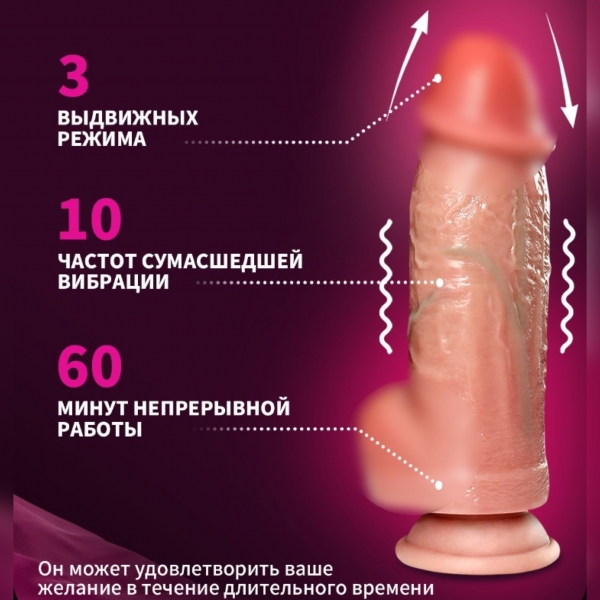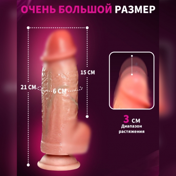 Вибратор очень большого диаметра, телескопический (движется 2-3см вперед-назад) на присоске с беспроводным пультом управления, реалистичный на ощупь, диаметр 6 см, вводимая длина 15 см., аккумуляторный, заряжается от usb, не гнётся тк внутри металлический механизм, снаружи силикон, рекомендуется использовать с лубрикантом.